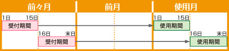 ◎使用日が1日〜15日の場合→受付期間:前々月1日から前々月15日まで