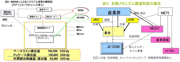 はじめに 20世紀が「地球資源の消費による発展の時代」とすれば、21世紀は、「地球環境の制約下での成長の時代」として、環境問題への人知の集約が不可避な時代だといえる。 環境の世紀を迎え、地球環境問題をはじめとする環境問題への対応が社会の最重要課題となっている。 地球環境問題への関心の高まりは、何と言っても地球温暖化問題の深刻化である。本問題は、各国首脳マターとしていまや国際社会の中心的課題として2005年7月に開催される主要先進国首脳会議・サミットの首題ともなった。 国際社会は、二酸化炭素(CO2)に代表される温室効果ガスの排出削減を国際的に取組むべく、1997年気候変動枠組条約第3回締約国会議(COP3)が京都で開催され、先進各国は温室効果ガスの大幅削減(1990年比2010年平均目標:日本は−6%、EUは−8%、米は−7%他)を約束した。 本件は、広く言われている将来の海面上昇のみでなく@異常気象の多発など「将来の危機ではなく今そこにある危機」であり、A2005年2月にはロシアの批准により京都議定書が発効の運びとなり国際的な義務とされ、さらにB各国政府・企業は「新たなグローバル・スタンダード」として戦略的に活用しようとする姿勢がうかがえることなどから、わが国として産官学の総力を結集した対応が必要であろう。 また、アジアをはじめとする発展途上国が、経済成長・人口増に伴ってCO2排出量が急増する中で、国際社会全体の排出量削減へ向けた取組みと、わが国が国際公約を達成するための手法として「京都メカニズム」の重要性が高まってきている。(図1及び図2参照) さらに、社会・産業活動の新しい基盤としての「CO2地中隔離」の果たす役割への期待が寄せられている。こうした状況の下、私達が子孫により良い地球環境を残すために何をなすべきか、また単なる夢の技術でなく産業技術として、いかに取組むべきであるかが今求められている。 ![]()