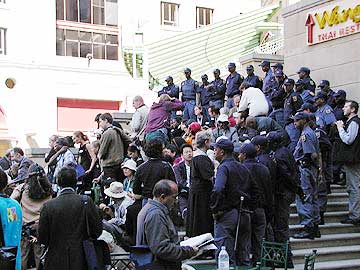 | 米国への抗議を唱えるグループとこれを取り囲みながら成りゆきを見守る警官 |